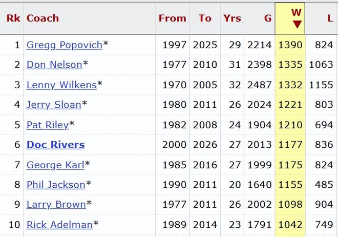 卡萊爾的生涯獲勝場數依然是999勝,連續(xù)12場敗北,讓他繼續(xù)無緣千勝里程碑。在NBA歷史上,目前一共有10位教練取得至少1000場勝利,排在首位的是波波維奇(1390勝),現役主教練中,只有雄鹿的老里弗斯在列,他獲得1177勝,在勝場排名中位列歷史第6。